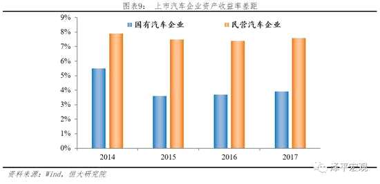 對汽車行業(yè)的長期保護(hù)導(dǎo)致占據(jù)市場競爭力較低,企業(yè)效率和創(chuàng)新能力較差。當(dāng)前中國汽車行業(yè)仍以國有控股企業(yè)占據(jù)主導(dǎo),然而規(guī)模效應(yīng)并未提升競爭力以及經(jīng)濟(jì)經(jīng)濟(jì)效益,國有控股企業(yè)盈利能力較民企明顯較低。從上市車企來看,2014-2017年上市國有汽車企業(yè)資產(chǎn)收益率較上市民企盈利水平有明顯差距。此外,國有控股企業(yè)過度依賴外資技術(shù)導(dǎo)致國有企業(yè)結(jié)構(gòu)發(fā)展失衡,創(chuàng)新能力不足。