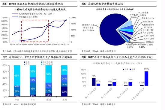 回顧1980年代后美國(guó)股市變遷的制度改革路徑。在1980年代之后美國(guó)機(jī)構(gòu)投資者進(jìn)入快速發(fā)展階段,在1980年初美國(guó)證券市場(chǎng)中機(jī)構(gòu)投資者持股占比約32%,但在2000年這一比例已經(jīng)提升至48%,目前占比約89.6%。1980年之后,美國(guó)機(jī)構(gòu)投資者的迅速發(fā)展主要源于兩方面變化:首先,美國(guó)從1981-2000年持續(xù)的慢牛市為培育機(jī)構(gòu)投資者創(chuàng)造了良好條件;其次,以401(K)為代表的美國(guó)養(yǎng)老金制度推動(dòng)了美國(guó)機(jī)構(gòu)投資者的發(fā)展壯大。美國(guó)在1974、1978年陸續(xù)推出個(gè)人退休金賬戶(即IRAs計(jì)劃)以及401(K)計(jì)劃,以IRAs和401(K)為代表的私人養(yǎng)老金,成為了美國(guó)共同基金和資本市場(chǎng)最主要的資金來(lái)源,其長(zhǎng)期穩(wěn)定的資金推動(dòng)了資本市場(chǎng)的穩(wěn)定健康發(fā)展。自1981年起,美國(guó)的養(yǎng)老金體系便開(kāi)始向資本市場(chǎng)“開(kāi)閘放水”,個(gè)人養(yǎng)老金賬戶是美國(guó)共同基金最重要的資金來(lái)源,其不僅僅推動(dòng)了美國(guó)機(jī)構(gòu)投資者的發(fā)展,也推動(dòng)了居民大類資產(chǎn)配置向證券市場(chǎng)轉(zhuǎn)移。對(duì)比海外居民大類資產(chǎn)配置結(jié)構(gòu),2016年美國(guó)居民資產(chǎn)中股票占比32%,而我國(guó)僅3%,而房地產(chǎn)在美國(guó)居民資產(chǎn)中占比30%,我國(guó)占了65%。除投資者結(jié)構(gòu)的變化以外,美國(guó)80年代高新技術(shù)產(chǎn)業(yè)和新興服務(wù)業(yè)的興起,也推動(dòng)了股市直接融資占比的提升。在1970-1986年美國(guó)直接融資占比平均僅35%,1986年后直接融資占比提升至50%左右。從IPO角度來(lái)看,1980年至1999年,信息技術(shù)、金融、可選消費(fèi)中的企業(yè)IPO數(shù)量位列所有行業(yè)前三,分別為278、187、181家,詳見(jiàn)《策略專題-金融:直接融資支持產(chǎn)業(yè)升級(jí)——當(dāng)前中國(guó)對(duì)比1980年代美國(guó)系列(2)-20180524》。