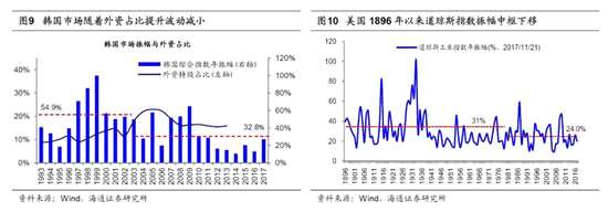參考海外經(jīng)驗(yàn),成熟的配置型市場(chǎng)中波動(dòng)率和換手率都較低。參考海外資本市場(chǎng)發(fā)展經(jīng)驗(yàn),美國(guó)、韓國(guó)股市在由交易型轉(zhuǎn)向配置型后,隨著機(jī)構(gòu)投資者(含外資)占比上升,股市波動(dòng)率明顯下降。美國(guó)在1980年以前市場(chǎng)中機(jī)構(gòu)投資者占比較低。在1896-1980年間,道瓊斯指數(shù)年均振幅約31%,從1980至今,道瓊斯指數(shù)年均振幅降至24%。韓國(guó)市場(chǎng)在納入MSCI指數(shù)后,隨著外資和機(jī)構(gòu)投資者在市場(chǎng)中的持股比例不斷提高,市場(chǎng)投資風(fēng)格更偏理性,也更加穩(wěn)定。1990s外資在韓國(guó)市場(chǎng)中成交額占比10%以下,韓國(guó)加權(quán)指數(shù)年均振幅約50%,指數(shù)整體PE(TTM)在10倍-40倍之間大幅波動(dòng)。2002年之后,韓國(guó)外資持股與外資市場(chǎng)成交額占比均超過(guò)10%,韓國(guó)股市穩(wěn)定性明顯增強(qiáng),韓國(guó)加權(quán)指數(shù)年均振幅也降至約33%,指數(shù)整體PE(TTM)保持在8倍-20倍之間小幅波動(dòng),市場(chǎng)穩(wěn)定性明顯提高。未來(lái)隨著我國(guó)機(jī)構(gòu)投資者的不斷發(fā)展壯大、養(yǎng)老金入市的進(jìn)程加快、以及A股擴(kuò)大對(duì)外開(kāi)放,機(jī)構(gòu)資金有望成為未來(lái)A股增量資金的主要來(lái)源,機(jī)構(gòu)投資者主導(dǎo)的市場(chǎng)將會(huì)更平穩(wěn)。從換手率角度來(lái)看,A股散戶投資者占比較高導(dǎo)致市場(chǎng)整體換手率高,A股2017年整體換手率為428%,遠(yuǎn)高于美國(guó)(116%)、韓國(guó)(112%)、日本(93%)。