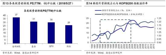 成熟配置型市場(chǎng)中,龍頭公司優(yōu)勢(shì)更明顯。未來(lái)以公募、保險(xiǎn)、社保養(yǎng)老金以及外資為主的機(jī)構(gòu)資金占比提升是大勢(shì)所趨,而散戶投資者占比將逐漸回落。實(shí)際上從14年以來(lái),散戶占比已經(jīng)在下降,剔除一般法人,散戶持有自由流通市值占比從14年6月的64.2%下降到17年9月的60.8%,其他機(jī)構(gòu)投資者合計(jì)占比從35.8%上升39.2%。相對(duì)于散戶,機(jī)構(gòu)投資者投資行為更加理性,機(jī)構(gòu)投資持股占比提高將強(qiáng)化龍頭股效應(yīng)。截至2018Q1,基金、QFII、保險(xiǎn)的重倉(cāng)股市值中位數(shù)分別為272億元、396億元、432億元,遠(yuǎn)高于全部A股市值中位數(shù)171億元;截止2018/05/27,基金、QFII、保險(xiǎn)重倉(cāng)股PE(TTM)中位數(shù)分別為31倍、30倍、26倍,低于全部A股估值中位數(shù)37倍,這也反映了機(jī)構(gòu)投資者投資風(fēng)格更理性、更穩(wěn)健。我們認(rèn)為,未來(lái)國(guó)內(nèi)機(jī)構(gòu)投資者和外資在市場(chǎng)中占比不斷提升有望強(qiáng)化A股中行業(yè)龍頭估值溢價(jià)的現(xiàn)象。參考海外市場(chǎng)經(jīng)驗(yàn),美股中行業(yè)龍頭企業(yè)如谷歌、蘋(píng)果、亞馬遜、耐克、諾華制藥等個(gè)股均存在估值溢價(jià)。在韓國(guó)資本市場(chǎng)逐漸對(duì)外開(kāi)放階段,隨著市場(chǎng)中外資占比不斷提升,價(jià)值股、大盤藍(lán)籌股表現(xiàn)更佳,韓國(guó)外資持股占比提升最快的時(shí)期是1997-2005年,這時(shí)期KOSPI200(代表大盤藍(lán)籌)/KOSPI的相對(duì)溢價(jià)率從1提高到1.2。A股機(jī)構(gòu)與外資投資者占比上升階段,龍頭有望持續(xù)享受估值溢價(jià)。