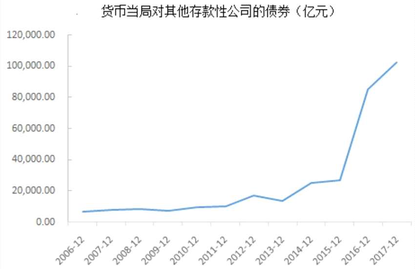 歷史數(shù)據(jù)來看,2013年后,央行對其他金融性公司債權(quán)大幅上升,從2013年底的1.3萬億元一路上升到2017年底的10.2萬億元。這已經(jīng)成為中國央行新的基礎(chǔ)貨幣投放工具。今年4月份數(shù)據(jù)為9.4萬億元,出現(xiàn)小幅回落收緊趨勢。