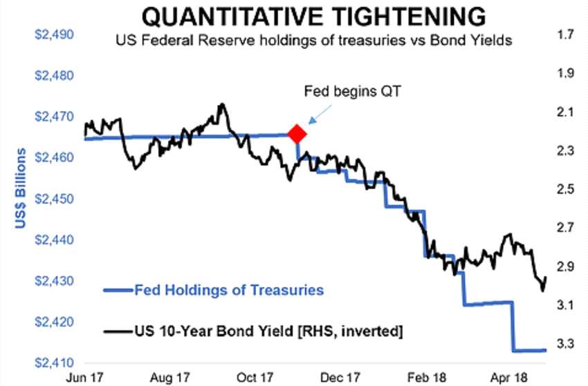 從2017年10月份開始,美聯(lián)儲開啟縮表進(jìn)程。整體來看,由于每月縮表規(guī)模僅100億美元。隨著這一過程的持續(xù),以及資產(chǎn)負(fù)債表規(guī)模明顯降低,其對金融市場更加廣泛的影響也將逐步體現(xiàn)出來。最明顯得表現(xiàn)就是,美國十年期國債收益率出現(xiàn)持續(xù)攀升,一度突破3%。