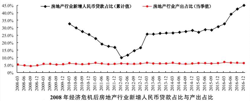數(shù)據(jù)來看,在2008年全球經(jīng)濟(jì)危機(jī)之后,中國房地產(chǎn)行業(yè)新增人民幣貸款占比比例在2012年之后,持續(xù)攀升,一度接近一半。