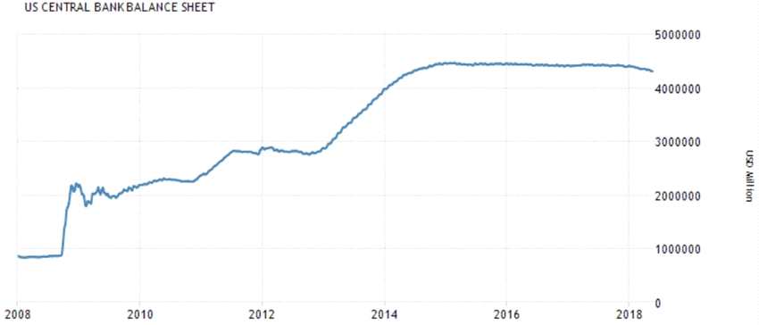 對比,美國央行負(fù)債表來看,從2008年1月份0.84萬億美元起步,一路飆升到了2018年1月的4.4萬億美元。美聯(lián)儲資產(chǎn)負(fù)債表規(guī)模相比實(shí)施量化寬松前擴(kuò)大了接近5倍。最新數(shù)據(jù)是4月份,美聯(lián)儲資產(chǎn)負(fù)債表規(guī)模為4.29萬億美元,美聯(lián)儲確實(shí)在持續(xù)縮表中,不過規(guī)模較小。
