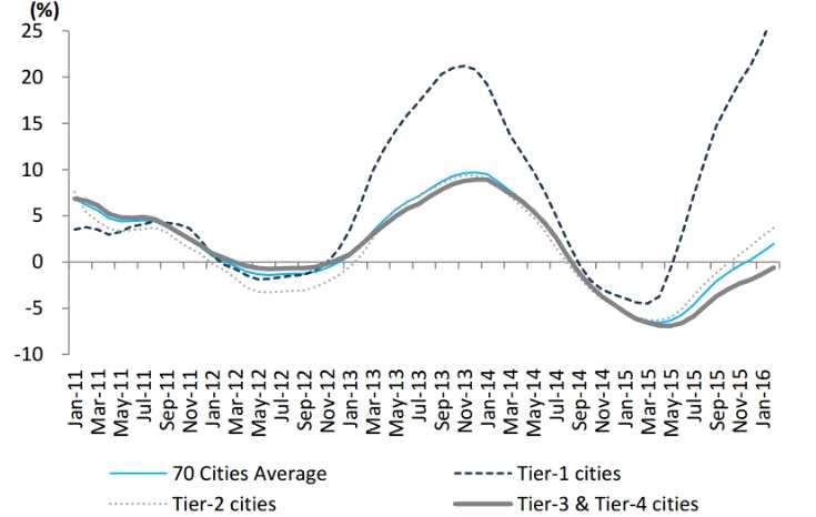 同樣情況在中國,在房地產(chǎn)普漲行情之后,2013年之后,特別是2015年,一線城市出現(xiàn)更大漲幅,其他城市則相對溫和。