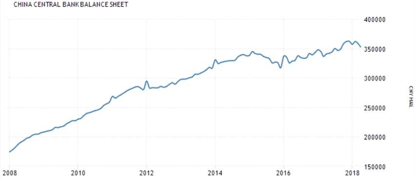 從央行資產(chǎn)負(fù)債平衡表來看,中國央行的總資產(chǎn)(總負(fù)債),2008年初16萬億起步,到2018年初35萬億,增長一倍多。截至3月底,中國央行的總資產(chǎn)(總負(fù)債)是35.96萬億。如果時間拉長來看,自加入WTO到2017年底,央行資產(chǎn)負(fù)債表年化增速17%。