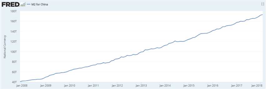 為方便統(tǒng)計,從2008年1月份計算,中國M2從41.7萬億元,增長到了2018年1月的172.9萬億元。中國M2十年內(nèi)漲幅4倍多。最新數(shù)據(jù)4月份M2是173.77萬億元。值得注意的是,中國M2的統(tǒng)計還不包括銀行理財,這部分的規(guī)模在2017年末接近30萬億,這意味著包括影子銀行以后的中國貨幣總量已經(jīng)接近200萬億。