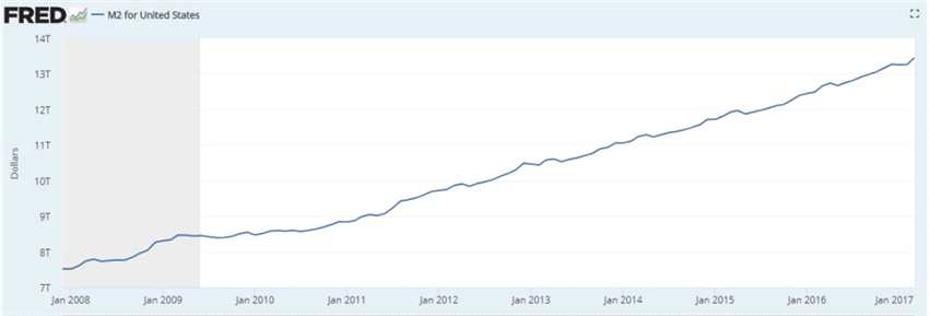 從M2與GDP之比來看,美國2017年GDP是19.36萬億美元,M2與GDP之比是72%。