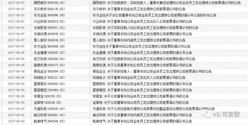 根據(jù)東方財(cái)富(300059,股吧)choice的統(tǒng)計(jì)數(shù)據(jù)顯示,僅2017年6月2日~6月7日的四個(gè)交易日中,A股就出現(xiàn)20家上市公司控股股東或董事長(zhǎng)呼吁員工增持,有約19家上市公司實(shí)控人或董事長(zhǎng)承諾保底。其中,包括安居寶(300155,股吧)、科陸電子(002121,股吧)、長(zhǎng)城動(dòng)漫(000835,股吧)、長(zhǎng)城影視(002071,股吧)、星徽精密(300464,股吧)、奮達(dá)科技(002681,股吧)、寶萊特(300246,股吧)、凱美特氣(002549,股吧)、智慧松德(300173,股吧)等個(gè)股。