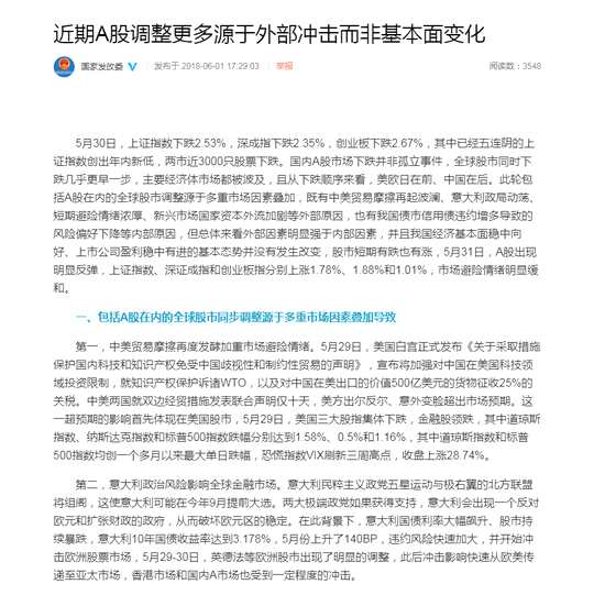 ,6月1日消息,發(fā)改委微博轉(zhuǎn)發(fā)中國(guó)宏觀經(jīng)濟(jì)研究院 博士文章稱,國(guó)內(nèi)A股市場(chǎng)下跌并非孤立事件,全球股市同時(shí)下跌幾乎更早一步,主要經(jīng)濟(jì)體市場(chǎng)都被波及,且從下跌順序來看,美歐日在前、中國(guó)在后。此輪包括A股在內(nèi)的全球股市調(diào)整源于多重市場(chǎng)因素疊加,既有中美貿(mào)易摩擦再起波瀾、意大利政局動(dòng)蕩、短期避險(xiǎn)情緒濃厚、新興市場(chǎng)國(guó)家資本外流加劇等外部原因,也有我國(guó)債市信用債違約增多導(dǎo)致的風(fēng)險(xiǎn)偏好下降等內(nèi)部原因,但總體來看外部因素明顯強(qiáng)于內(nèi)部因素,并且我國(guó)經(jīng)濟(jì)基本面穩(wěn)中向好、上市公司盈利穩(wěn)中有進(jìn)的基本態(tài)勢(shì)并沒有發(fā)生改變,股市短期有跌也有漲。