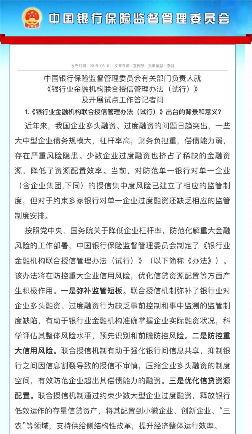 摘要: 企業(yè)去杠桿再下狠招!為抑制多頭融資、過度融資行為,有效防控企業(yè)杠桿率上升引發(fā)的信用風險,6月1日,銀保監(jiān)會發(fā)布《銀行業(yè)金融機構聯(lián)合授信管理辦法(試行)》,明確要求各地建立對部分企業(yè)的聯(lián)合授信試點,納入