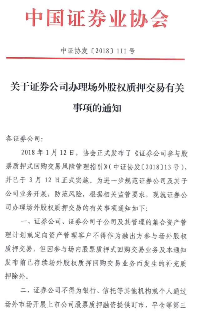 此次協(xié)會發(fā)布的通知,承襲了2018年2月滬深交易所舉行的股票質(zhì)押回購業(yè)務(wù)會議中監(jiān)管層領(lǐng)導(dǎo)關(guān)于“證券公司不得作為質(zhì)權(quán)人參與場外股權(quán)質(zhì)押”“證券公司不得為場外股權(quán)質(zhì)押提供第三方服務(wù)”的表態(tài),“可以認(rèn)為是將前期的監(jiān)管態(tài)度做出了一個明文的規(guī)定,從整體來看,新規(guī)并無超預(yù)期的因素”。