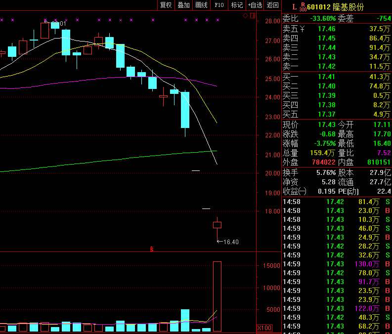 受光伏新政影響,隆基股份6月4日、6月5日連續(xù)一字跌停,今日再度大跌3.75%,收盤價報收17.43元,3天暴跌22%。而從5月15日股價28.01元的高位下來,至今20天股價就跌去了38%。