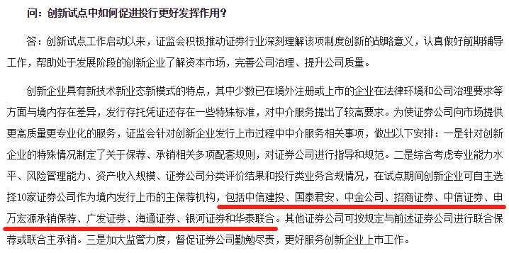 其中,證監(jiān)會明確在試點期間創(chuàng)新企業(yè)可自主選擇10家證券公司作為境內(nèi)發(fā)行上市的主保薦機(jī)構(gòu),包括中信建投(601066,股吧)證券、國泰君安(601211,股吧)證券、中金公司、招商證券(600999,股吧)、中信證券(600030,股吧)、申萬宏源(000166,股吧)承銷保薦、廣發(fā)證券(000776,股吧)、海通證券(600837,股吧)、銀河證券和華泰聯(lián)合證券。其他證券公司可按規(guī)定與前述證券公司進(jìn)行聯(lián)合保薦或聯(lián)合主承銷。