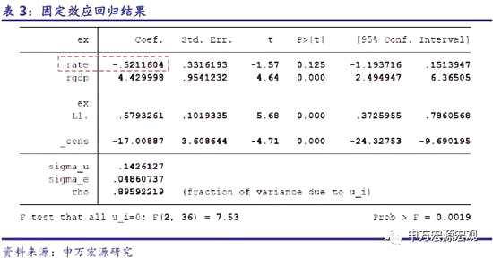 我們采用stata軟件進(jìn)行實(shí)證檢驗。首先是基本的面板數(shù)據(jù)模型(分為固定效應(yīng)和隨機(jī)效應(yīng)),豪斯曼檢驗得出P值為0.0008,說明應(yīng)采用固定效應(yīng)模型的回歸結(jié)果,具體見表3??梢钥闯觯嗣駧艃睹涝獏R率rate對應(yīng)的彈性系數(shù)是-0.52,說明人民幣升值1%(等價于出口價格增加1%),將導(dǎo)致“制造計算機(jī)、電子和光學(xué)產(chǎn)品”、“電氣設(shè)備制造”、“機(jī)械設(shè)備制造”三大行業(yè)整體對美出口減少0.52%。需要指出的是,該彈性系數(shù)并未通過顯著性檢驗(P值為0.125),回歸結(jié)果并不理想。原因可能是內(nèi)生性、模型設(shè)定偏誤等問題導(dǎo)致的。