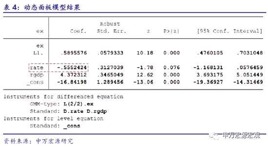接下來,我們采用Arellano-Bond提出的動態(tài)面板模型進(jìn)行分析,該模型對滯后項、以及內(nèi)生性問題有相應(yīng)的處理,具體結(jié)果見表4??梢钥吹剑嗣駧艃睹涝獏R率rate對應(yīng)的彈性系數(shù)約-0.56,并通過了顯著性檢驗(P值為0.076)。說明人民幣升值1%(等價于出口價格增加1%),將導(dǎo)致“制造計算機(jī)、電子和光學(xué)產(chǎn)品”、“電氣設(shè)備制造”、“機(jī)械設(shè)備制造”三大行業(yè)整體對美出口減少0.56%。簡單外推可知,加稅25%將引致上述三大行業(yè)對美出口減少25*0.56%=14%。因此,18年7月美國根據(jù)清單1對340億美元商品征收25%關(guān)稅,將導(dǎo)致上述三大行業(yè)對美出口直接減少340*14%=47.6億美元;如果后續(xù)美國對清單2中160億美元商品(共計500億美元)也征收25%關(guān)稅,那么上述三大行業(yè)對美出口將直接減少(340+160)*14%=70億美元。