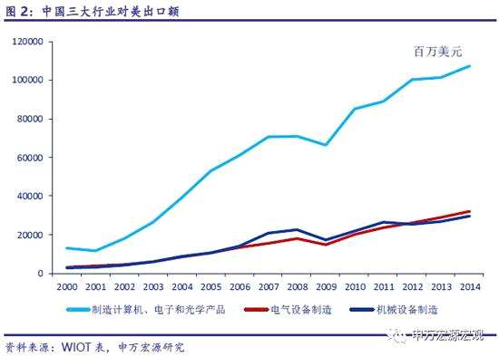 由于后續(xù)要著重分析加稅后的行業(yè)沖擊分布,需要用到世界投入產(chǎn)出表(WIOT表)。為了前后一致,我們這部分的實(shí)證也采用的是WIOT表的數(shù)據(jù)。數(shù)據(jù)來源為http://www。wiod。org,最新數(shù)據(jù)為2014年。通過對比,中國的2025戰(zhàn)略行業(yè)對應(yīng)WIOT表中的“制造計算機(jī)、電子和光學(xué)產(chǎn)品”、“電氣設(shè)備制造”、“機(jī)械設(shè)備制造”三大行業(yè),我們梳理了2000-2014年的對美出口數(shù)據(jù),作為實(shí)證樣本。