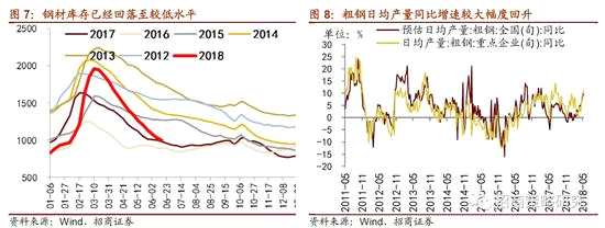 鋼材庫存持續(xù)回落,粗鋼日均產(chǎn)量攀升。6月15日,主要鋼材庫存為998萬噸,與歷史庫存量相比處于較低的水平,同比增速回落至1.89%。截至5月末,重點企業(yè)粗鋼日均產(chǎn)量為195萬噸,同比增速達到10.82%,同時預(yù)估日均產(chǎn)量同比增速也處于不斷回升的態(tài)勢。