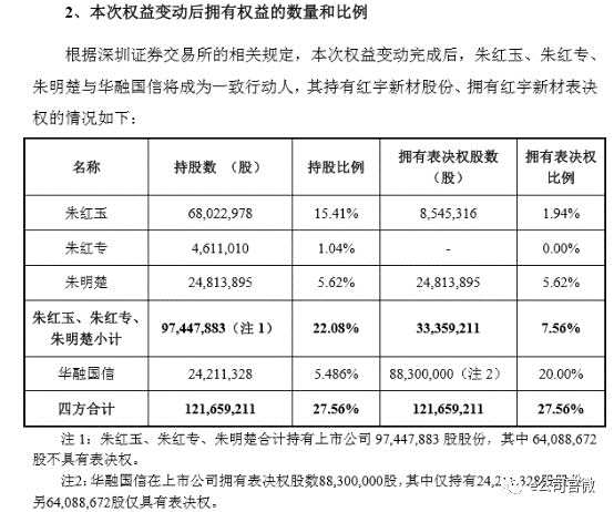 根據(jù)權(quán)益變動報告書,本次交易完成后華融國信將直接持有紅宇新材5.48%的股份,同時,通過表決權(quán)委托的方式獲得紅宇新材14.52%股份的表決權(quán)、提案權(quán)等,合計擁有表決權(quán)占公司總股本的20%。華融國信將成為紅宇新材控股股東,朱紅玉、朱紅專、朱明楚將與其為一致行動人,公司的實際控制人由朱紅玉變更為輿情戰(zhàn)略研究中心。