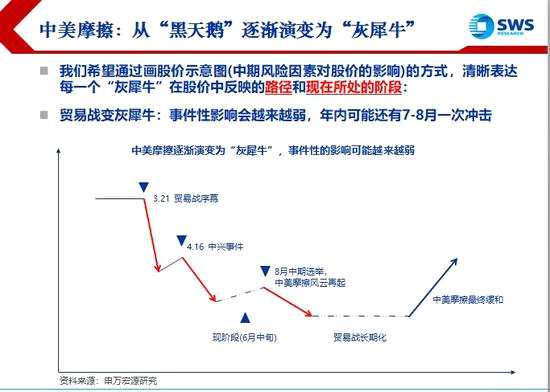 二、今年A股走勢受到中美貿(mào)易摩擦沖擊嚴(yán)重,幾次下跌的時(shí)間節(jié)點(diǎn)都與貿(mào)易戰(zhàn)相關(guān)事件重合。但申萬宏源認(rèn)為事件性影響會越來越弱,年內(nèi)可能還有7-8月一次沖擊。