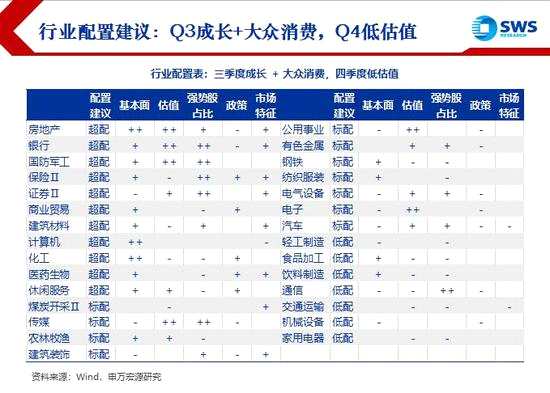 八、申萬宏源給出行業(yè)配置建議,在Q3配置成長+大眾消費(fèi)行業(yè),Q4配置低估值行業(yè)。