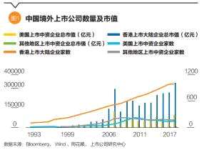 多層次市場(chǎng)的建立,為我國(guó)的一大批新經(jīng)濟(jì)和高新技術(shù)企業(yè)提供了資本市場(chǎng)服務(wù),但是,仍有大量企業(yè)無(wú)緣資本市場(chǎng),尤其是成長(zhǎng)迅速的互聯(lián)網(wǎng)企業(yè)。我國(guó)經(jīng)濟(jì)中成長(zhǎng)最迅速的一批公司在海外市場(chǎng)上市。2017年底,中國(guó)境內(nèi)外上市公司合計(jì)4286家,總市值88.9萬(wàn)億元人民幣,而同期A股市場(chǎng)總市值僅56萬(wàn)億元(參見(jiàn)圖1)。大量企業(yè)在境外市場(chǎng)上市,不僅影響了A股市場(chǎng)的規(guī)模,也在一定程度上影響了A股上市公司的總體成長(zhǎng)性與盈利能力(參見(jiàn)本期《A股上市公司20年發(fā)展情況報(bào)告》)。
