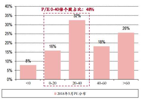 截至今年5月,A股中0-40倍市盈率的個(gè)股占比為48%,相比于歷史上歷次底部,并不占優(yōu);再看估值高于60倍的個(gè)股數(shù)量,占比為26%,雖較2016年1月的2638點(diǎn)時(shí)的40%下降了14%,但高于歷史上其它低點(diǎn)。