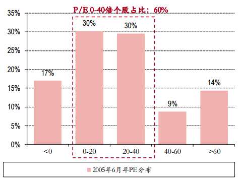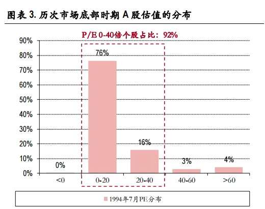 據(jù)中銀國(guó)際統(tǒng)計(jì),歷次市場(chǎng)底部時(shí),0-40倍市盈率個(gè)股比重分別為92%、60%、72%、54%和34%。