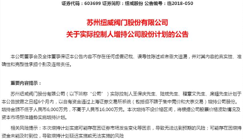 紐威股份(603699,股吧)昨日晚間也發(fā)布計劃增持公告。實際控制人王保慶、陸斌、程章文、席超計劃在6個月內(nèi),以自有資金增持公司股份,增持金額不低于6000萬元,不高于1.6億元。上述4人及其控制的公司同時承諾,在增持實施期間及法定期限內(nèi)不減持所持有的公司股份。