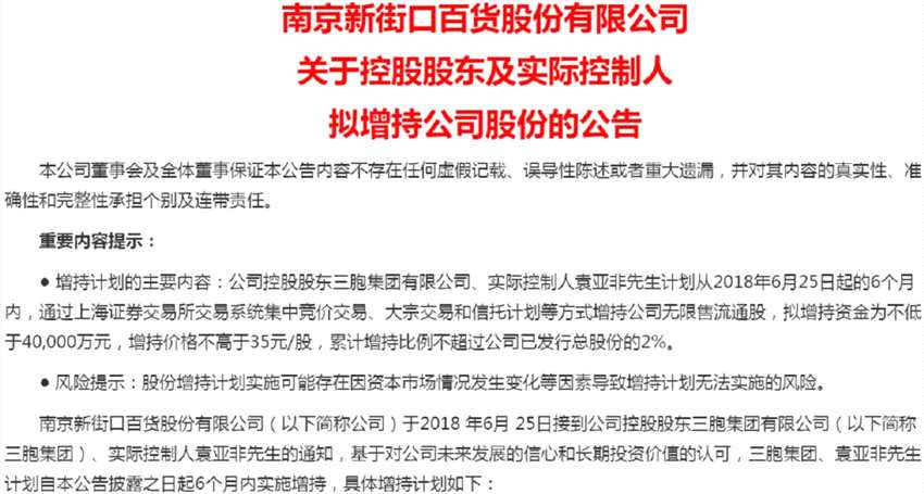 南京新百(600682,股吧)控股股東三胞集團、實際控制人袁亞非計劃從2018年6月25日起的6個月內(nèi)增持公司股票,擬增持資金為不低于4億元,增持價格不高于35元/股,累計增持比例不超過公司已發(fā)行總股份的2%。