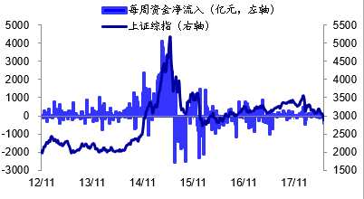上周資金凈流出408億。其中資金流入方面(銀證轉(zhuǎn)賬數(shù)據(jù)自2017年6月16日后未更新,因此不統(tǒng)計該數(shù)據(jù)),融資余額減少395億元;公募基金新發(fā)行增加34億元;滬股通規(guī)模減少21億元;深股通規(guī)模減少0.1億元。資金流出方面,IPO融資規(guī)模11億,產(chǎn)業(yè)資本凈增持17億,交易費用為32億。前一周資金凈流出69億,從16年2月份以來資金流入流出整體平穩(wěn)。