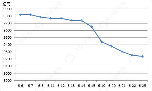 場內(nèi)資金的代表——兩融余額從6月6日的9819億元,一路回落到6月25日的9237億元,累計(jì)減少了582億元(見下圖);
