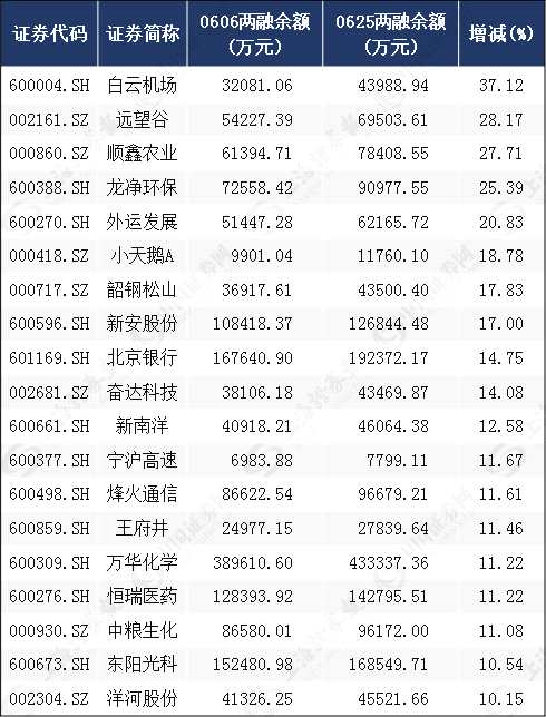 其中,增幅超過10%的個股有19只(見下表),白云機(jī)場(600004,股吧)的兩融余額從32081.06億元增加到43988.94億元,以37.12%的增幅居首。
