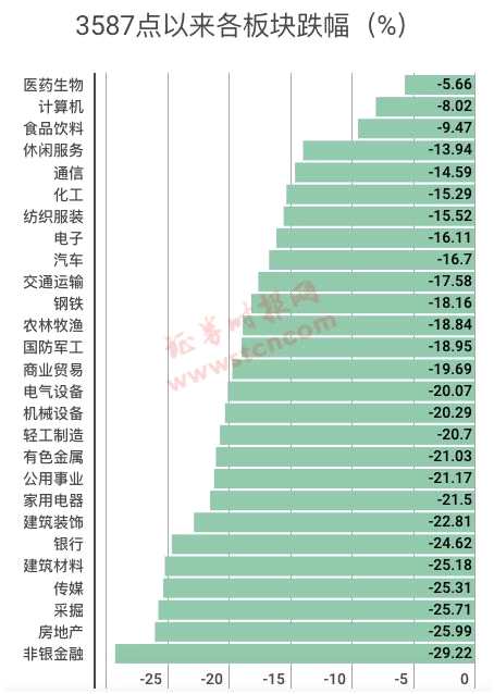 Wind統計數據顯示,1月29日以來,醫(yī)藥、計算機和化工分別下跌5.66 %、8.02%、9.47%,跌幅小于滬指跌幅。
