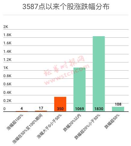 剔除上市不足一年的次新股、停牌個股后,3437只交易個股中,有110只跌幅超過50%,1830只個股跌幅介于20%—50%,1069只個股跌幅低于20%。