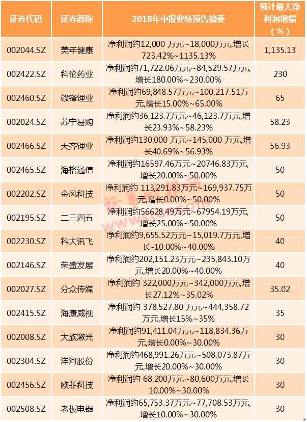 其中,美年健康(002044,股吧)預(yù)計上半年盈利1.2億元~1.8億元,同比增長723.42%~1135.13%。另外,科倫藥業(yè)(002422,股吧)預(yù)計凈利潤同比最大增幅達(dá)230%,此外,贛鋒鋰業(yè)(002460,股吧)、蘇寧易購(002024,股吧)、天齊鋰業(yè)(002466,股吧)等6股預(yù)計上半年凈利潤同比增幅達(dá)50%或以上。