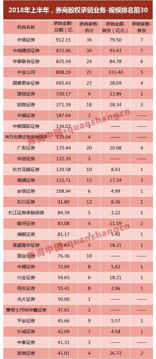 上半年結束,券商的股權承銷業(yè)務排行也隨之出爐,但頭部位置缺乏變化,前五名與去年上半年保持一致,中信證券、中信建投、華泰聯(lián)合、中金公司與國泰君安等5家公司依然固守前五名位置。