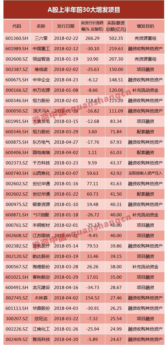 按發(fā)行日期統(tǒng)計,今年上半年的前五大增發(fā)項目分別是三六零(601360,股吧)、中國重工(601989,股吧)、領益智造(002600,股吧)、維信諾(002387,股吧)和中華企業(yè)(600675,股吧),分別實際融資502.35億元、219.63億元、207.3億元、150億元和148.51億元。