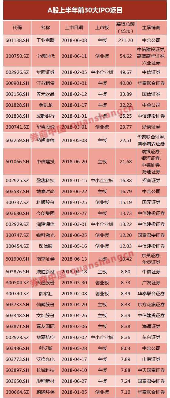 除了工業(yè)富聯(lián)外,上半年的5大IPO項目還包括寧德時代(300750,股吧)、華西證券(002926,股吧)、江蘇租賃(600901,股吧)和養(yǎng)元飲品(603156,股吧),募資總額分別為54.62億元、49.67億元、40億元和33.89億元,上述4家公司中,寧德時代的聯(lián)席主承銷商包括中信建投、高盛高華與興業(yè)證券(601377,股吧),其余3家的主承銷商分別是中信證券、華泰聯(lián)合證券與國信證券(002736,股吧)。