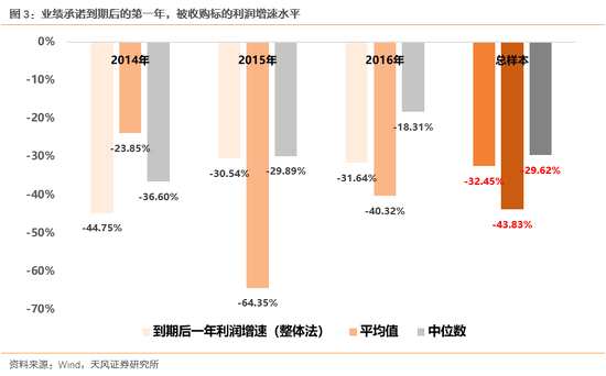 而從前期已經(jīng)結(jié)束的業(yè)績(jī)承諾案例來(lái)看,被收購(gòu)標(biāo)的業(yè)績(jī)?cè)跇I(yè)績(jī)承諾結(jié)束后的第一年,普遍有30%左右的下滑,原因在于很多公司為了完成業(yè)績(jī)承諾的目標(biāo),把利潤(rùn)“前移”、減值和費(fèi)用“后移”。