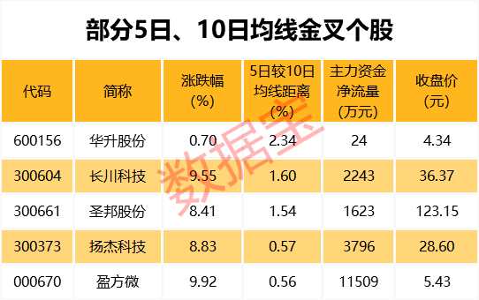 截至6月29日收盤,有5只A股的5日均線主動(dòng)上穿10日均線,其中華升股份(600156,股吧)、長川科技(300604,股吧)、圣邦股份(300661,股吧)等個(gè)股的5日均線較10日均線距離最大,分別達(dá)2.34%、1.60%、1.54%。