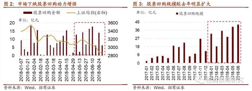 ? 在近期市場連續(xù)大幅下調(diào)的情況下,股票回購明顯增加,前6個月的股票回購規(guī)模已經(jīng)遠超2017年全年的水平。具體來看,今年前6個月,股票回購規(guī)模累計196.85億元,月均回購32.81億元;而2017年全年總回購規(guī)模僅為145.3億元,月均12.11億元。在當前這樣市場低點行股票回購體現(xiàn)出上市公司呵護股價的意圖,同時由于其擁有的信息優(yōu)勢而向市場傳遞出積極信號,即看好公司未來的市場表現(xiàn),一定程度上有利于穩(wěn)定投資者信心。