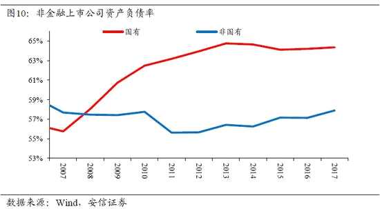 研究不同口徑的企業(yè)部門的資產(chǎn)負債率數(shù)據(jù)容易發(fā)現(xiàn),無論是工業(yè)企業(yè)還是非金融上市公司,以資產(chǎn)負債率形式體現(xiàn)的杠桿上升主要集中在國有企業(yè);作為對比,金融危機以來,民營企業(yè)的杠桿率總體上沒有上升。