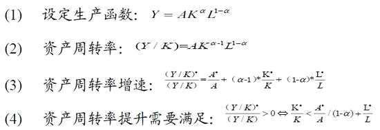 如果把經(jīng)濟總量的生產(chǎn)函數(shù)處理成柯布-道格拉斯生產(chǎn)函數(shù),在經(jīng)濟處于長期均衡狀態(tài)的條件下,就可以計算出資產(chǎn)周轉(zhuǎn)率的數(shù)學表達以及資產(chǎn)周轉(zhuǎn)率變化的條件和方向。過程如下: