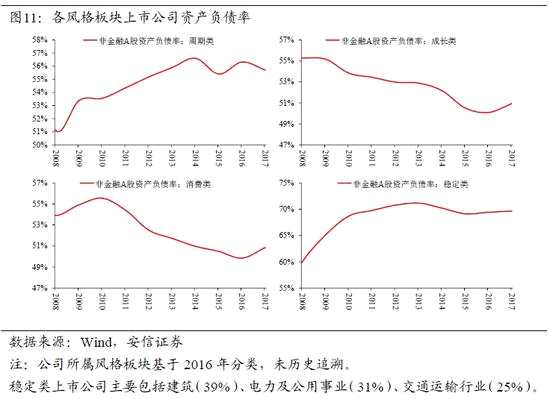 更細致的行業(yè)分類顯示,杠桿率的上升主要集中在周期類的板塊,以及電力、交運和建筑等具有周期色彩的行業(yè);其他板塊的企業(yè)總體上也沒有經(jīng)歷杠桿率的提高。