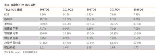 17年Q4創(chuàng)業(yè)板的盈利增速和盈利能力ROE都出現(xiàn)了非常大幅度的回落,17Q3創(chuàng)業(yè)板整體(剔除溫氏樂視)凈利潤累計同比增長23.9%、ROE(TTM)9.24%,17Q4則分別大幅下降到3%和7.86%。