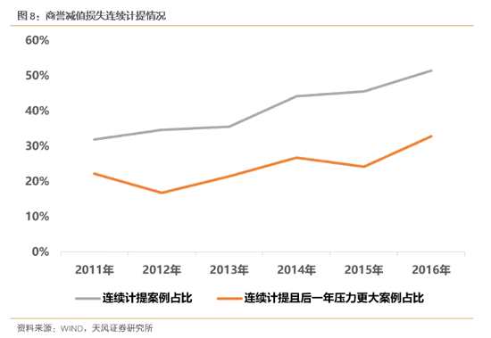 首先,從歷史數(shù)據(jù)來看,連續(xù)兩年計提商譽減值準備的案例占總案例的比重不超過50%,這其中,連續(xù)兩年計提且后一年計提數(shù)大于前一年的案例占比不到30%。因此17年如果是集中減值的一年,意味著這些標的18年的減值壓力很可能是降低的。