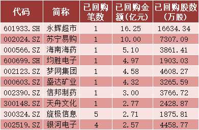 從今年實施回購的金額來看,排名前三的分別為永輝超市(601933,股吧)、蘇寧易購(002024,股吧)和海南海藥(000566,股吧),回購金額分別為16.25億元,10億元和5.09億元。此外,均勝電子(600699,股吧)、夢網(wǎng)集團(002123,股吧)、盛達礦業(yè)(000603,股吧)等35 家公司回購金額超過億元,海聯(lián)金匯(002537,股吧)、科達股份(600986,股吧)、中恒電氣(002364,股吧)等26家公司回購金額超過5000萬元。