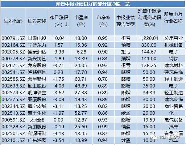 據(jù)Wind統(tǒng)計(jì)顯示,目前已預(yù)告中報(bào)業(yè)績(jī)的破凈股有35只,其中兩只為不確定,中報(bào)業(yè)績(jī)預(yù)喜的破凈股21只,占比超過(guò)六成。