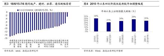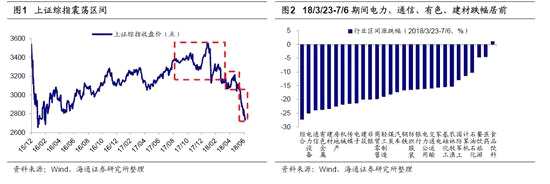 市場已經(jīng)進(jìn)入至暗時(shí)刻。回顧年初至今市場表現(xiàn),以中美貿(mào)易摩擦為界,可分為兩個(gè)運(yùn)行區(qū)間。年初至3月22日市場在正常區(qū)間波動(dòng),上證綜指維持在自17年9月以來的3200-3500震蕩區(qū)間。1月春季躁動(dòng),1月29日受美股下跌影響,上證綜指自3587高點(diǎn)短期急跌至3062點(diǎn),春節(jié)后市場反彈回到3250點(diǎn)附近。震蕩區(qū)間被破壞始于3月22日特朗普宣布將有可能對(duì)從中國進(jìn)口的600億美元商品加征關(guān)稅,隨后至今市場進(jìn)入持續(xù)下行區(qū)間。這期間有兩個(gè)關(guān)鍵跳空缺口,我們也可稱之為“特朗普跳空”,第一次是3月23日受中美貿(mào)易摩擦影響,上證綜指當(dāng)日下跌3.4%,之后落入3000-3200區(qū)間,第二次跳空是6月15日特朗普“撕毀”中美經(jīng)貿(mào)聯(lián)合聲明,再次宣布將對(duì)中國500億商品征收關(guān)稅,6月19日上證綜指下跌3.85%,在隨后的過去三周上證綜指相繼突破3000、2900、2800點(diǎn),截至上周最低點(diǎn)2691距離2016年1月底2638點(diǎn)僅一步之遙,A股迎來至暗時(shí)刻。這一輪市場調(diào)整是內(nèi)外因交織的結(jié)果,國內(nèi)去杠桿背景下資管新規(guī)的推出影響了股市微觀資金供求,外部中美貿(mào)易摩擦不斷反復(fù)影響了市場情緒。從行業(yè)表現(xiàn)看,3月23日以來,跌幅最大的行業(yè)包括電力設(shè)備(-25%)、通信(-24%)、有色(-24%)、建材(-23%)、房地產(chǎn)(-23%)。過去三周跌幅較大行業(yè)分兩塊,一塊是受近期傳言棚改政策收緊影響的地產(chǎn)產(chǎn)業(yè)鏈,房地產(chǎn)(-15%)、建材(-13%)、輕工(-13%),另一塊是包括家電(-13%)、白酒(-10%)、醫(yī)藥(-9%)在內(nèi)的前期強(qiáng)勢股補(bǔ)跌。